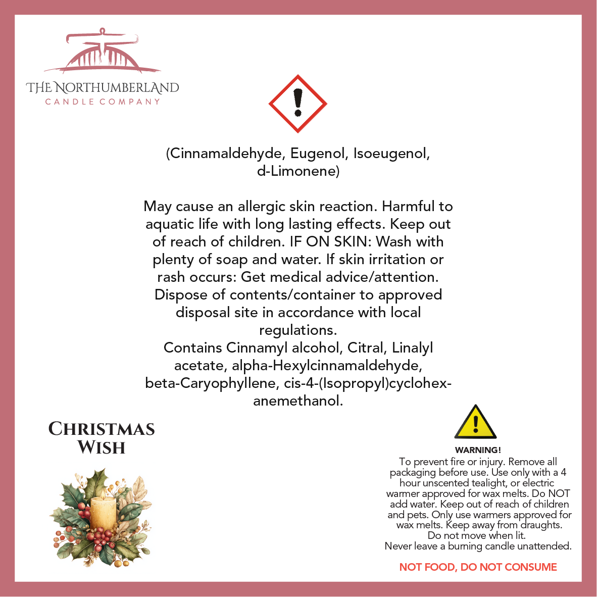 Christmas Wish opens with the rich warmth of cinnamon and clove, balanced by a heart of bright orange and juicy mandarin. Resting on a smooth base of soft woods and musk, this fragrance captures the essence of festive comfort - cosy, uplifting, and full of seasonal cheer.