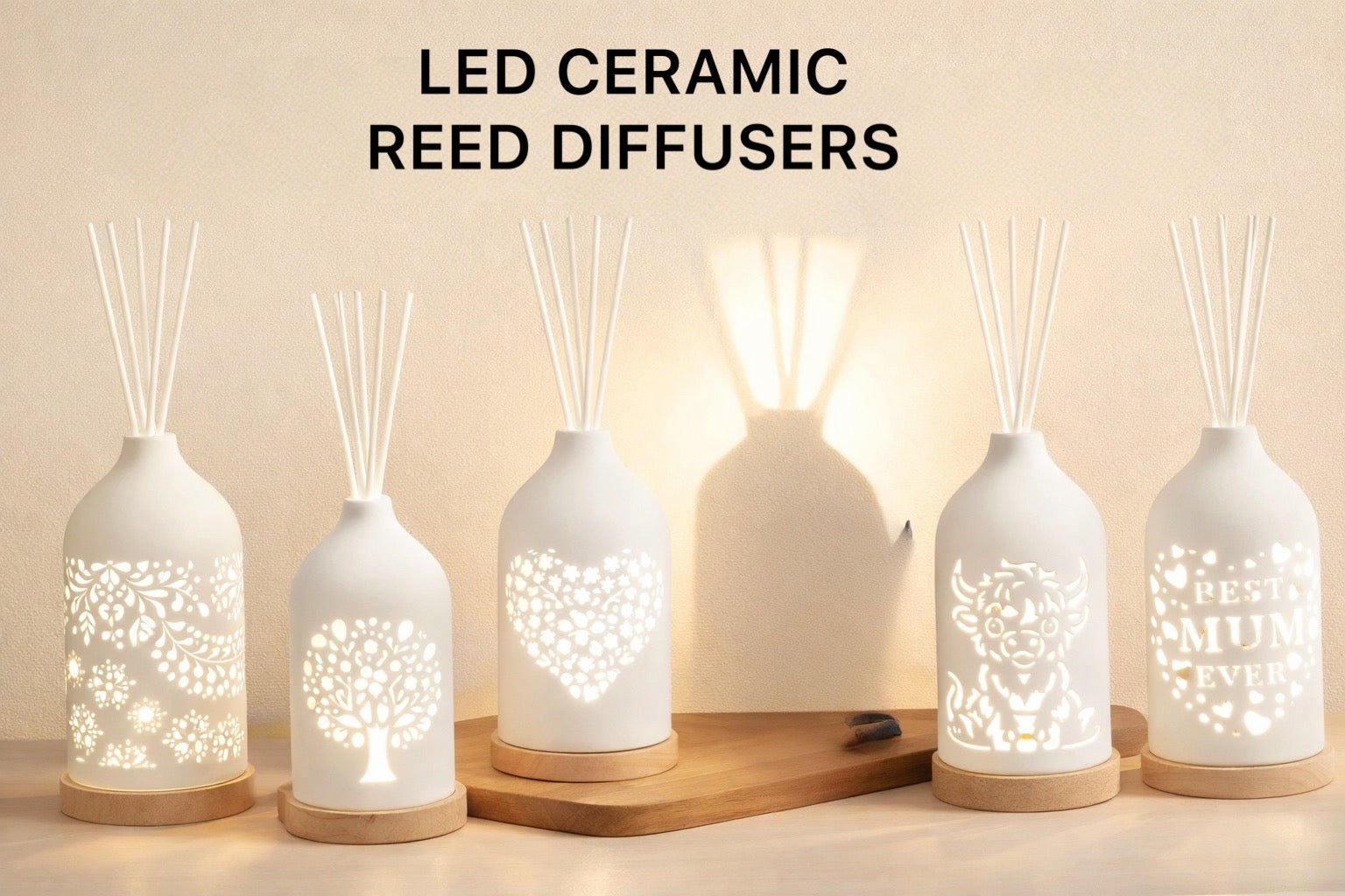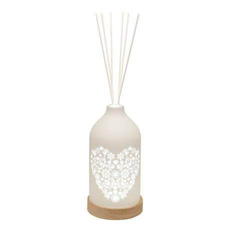 These beautiful elegant looking ceramic reed diffusers come complete with a bottle of clean linen fragranced liquid which sits on the LED light. The white ceramic decorative cover sits over the top which then displays the beautiful design through.